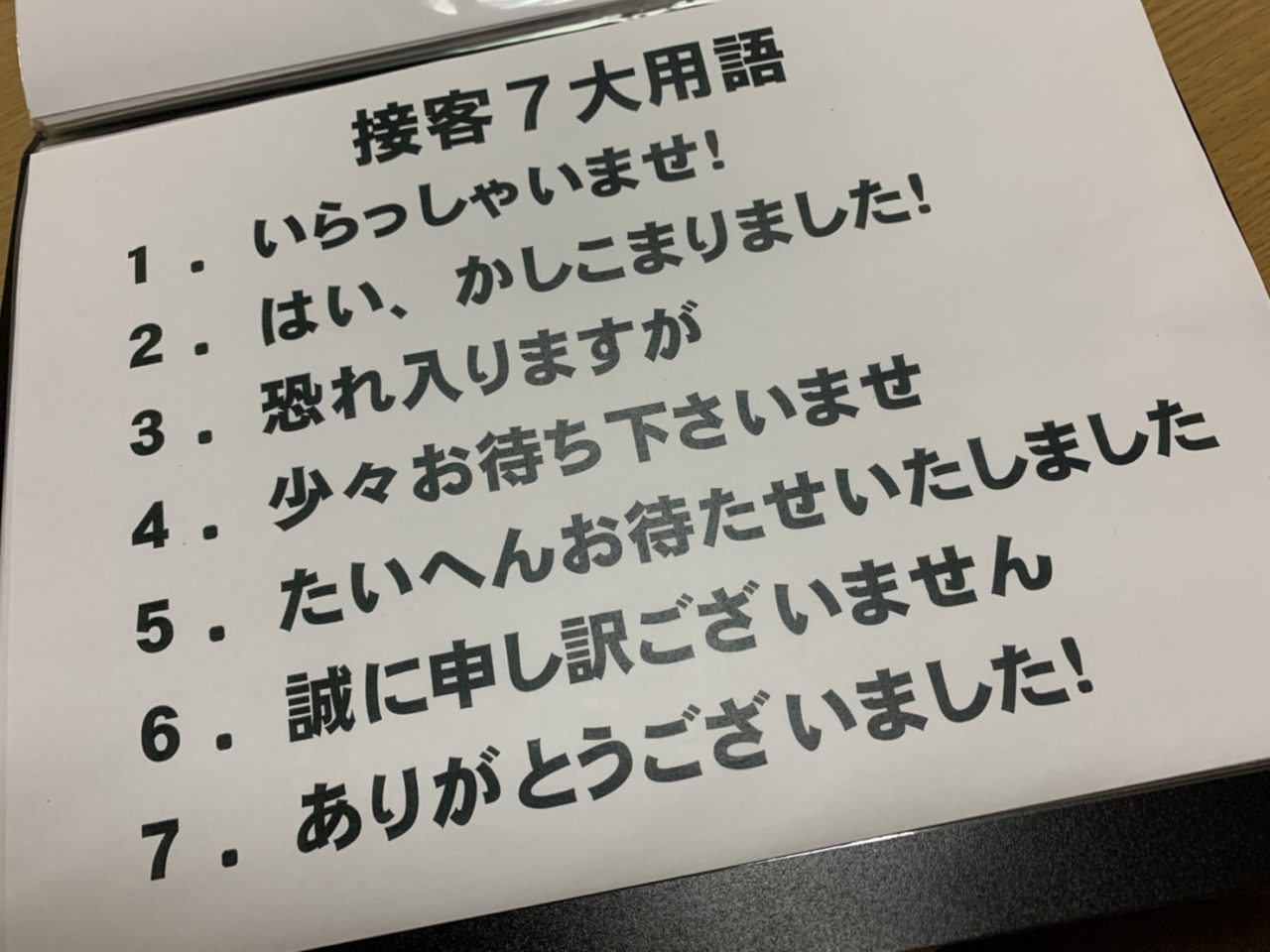 ふと壁に目をやるとその新人研修でも必ず行う’接客7大用語’が掲示されていました